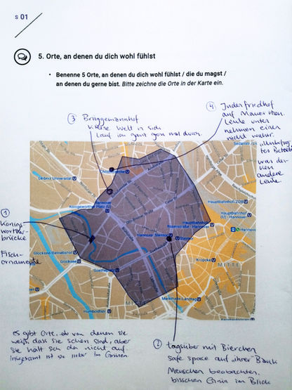 Hier siehst du ein Beispiel des Tools für unser Projekt in Hannover. Die handschriftlichen Notizen sind bei Gesprächen mit Expert*innen des Alltags entstanden, die ihren Blick auf die Stadt mit uns geteilt haben. Die PDF-Datei, die du oben herunterladen kannst, ist universeller gestaltet, sodass du z.B. selbst die passende Stadtkarte einfügen kannst.